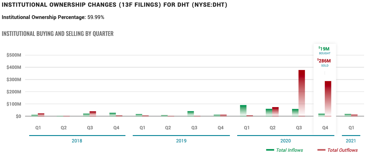 데이터베이스에 따르면 DHT 홀딩스의 롱 헤지 펀드 포지션 수는 2020 년 4 분기 말에 감소했습니다. 12 월 말까지 DHT 홀딩스에 포지션을 보유한 헤지 펀드가 18 개였으며, 3 월말에는 24 개 펀드가 있었습니다. 이 회사의 가장 큰 이해 관계자는 짐 사이먼의 르네상스 테크놀로지로 12 월 말에 3100만 달러를 투자 한 6,000만 주를 보유하고 있습니다.