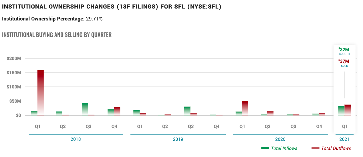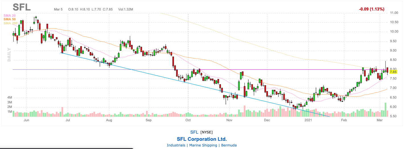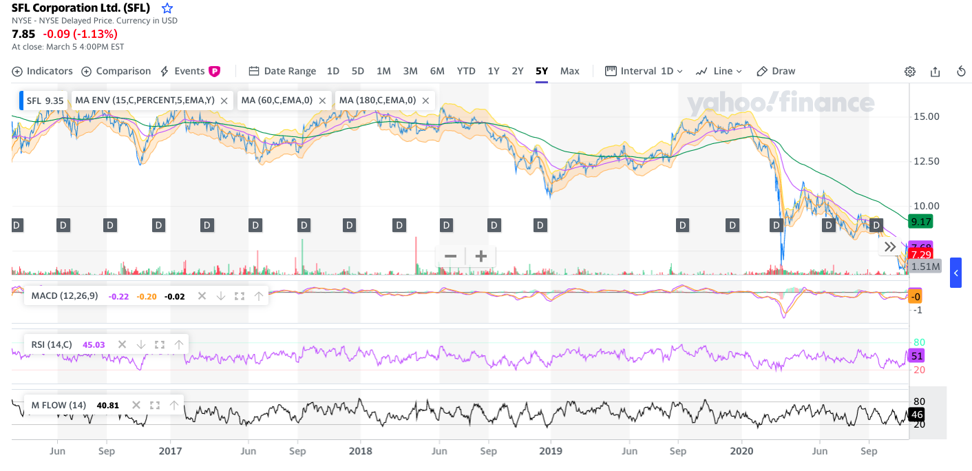 84 이상 선박으로, 버뮤다 기반 SLF 공사로 이 회사는 원유 유조선, 벌크 및 광석 선박, 건식 벌크 선 및 컨테이너 선에 이르는 다양한 선박을 보유하고 있습니다. 회사의 주식은 지난 12 개월 동안 34 % 감소했습니다. 감소에도 불구하고 2020 년 4 분기 동안 SFL은 1 억 1,500만 달러의 강력한 영업 수익을 보고했습니다. 이 회사는 또한 분기 별 주당 0.15 달러의 현금 배당금을 3 월 30 일에 지급합니다.