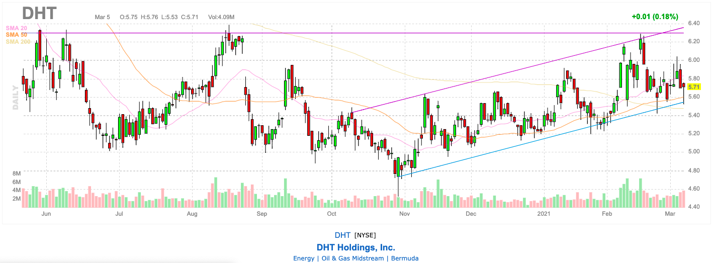 DHT Holdings는 버뮤다 해밀턴에 본사를 두고 있습니다. 2020 년 1 분기에 이 회사는 8,360,850 톤의 용량으로 총 27대의 VLCC를 운항했다고 보고했습니다. DHT는 3.50 % 의 배당 수익률을 제공합니다. 2020 년 4 분기 동안 회사는 2 억 6,630만 달러의 순이익을 보고했으며 이는 회사의 최고 실적을 기록했습니다. 이 회사는 최근 대우에서 VLCC 선박 2 척을 구입했고, 2021 년 상반기에 도착할 예정입니다.