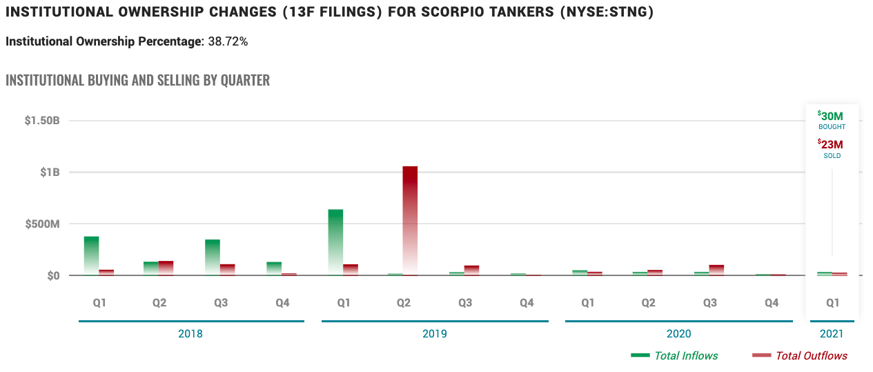 Scorpio Tankers, Inc. 는 전 세계적으로 정제된 석유 제품의 선도적인 운송 업체 중 하나입니다. 이 회사는 10 개의 제품 탱커에서 128 개의 제품 탱커와 베어 보트 전세에 자금을 지원합니다. STNG의 점유율은 지난 12 개월 동안 3 % 감소했습니다.