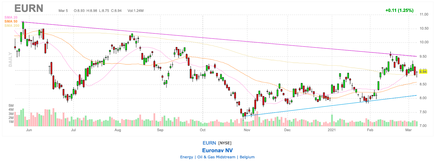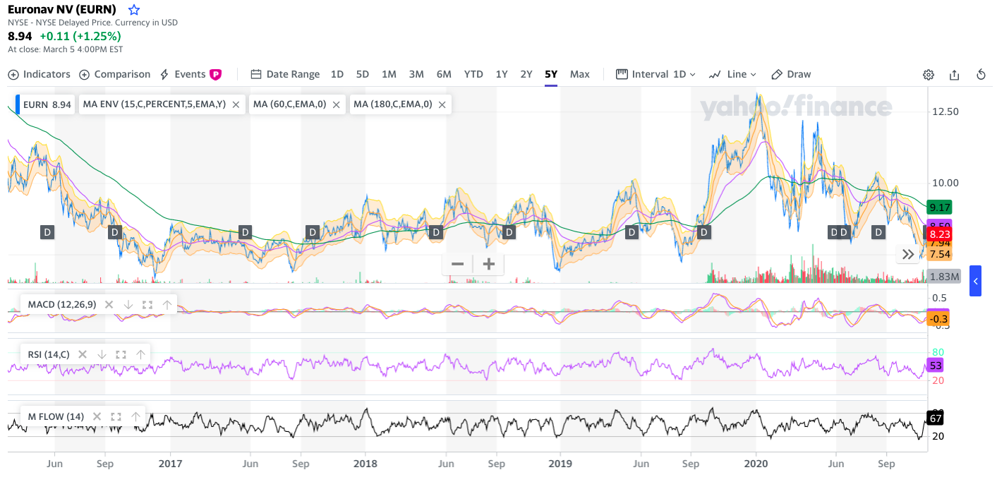 벨기에 기반 Euronav NV는 원유의 운송 및 저장을 제공합니다. 또한 차량 관리, 보호 관리 및 운영 관리와 같은 운송 서비스도 제공합니다. 이 회사는 최근 1 억 1,300만 달러의 가격에 eco-Suezmax 선박 2 대를 구입했습니다. 그러나 선박은 2022 년 1 월 인도될 한국 조선소에 아직 남아 있습니다. 회사는 2020 년 3 분기에 1,850만 달러 또는 주당 0.9 달러의 배당금을 보고했습니다.