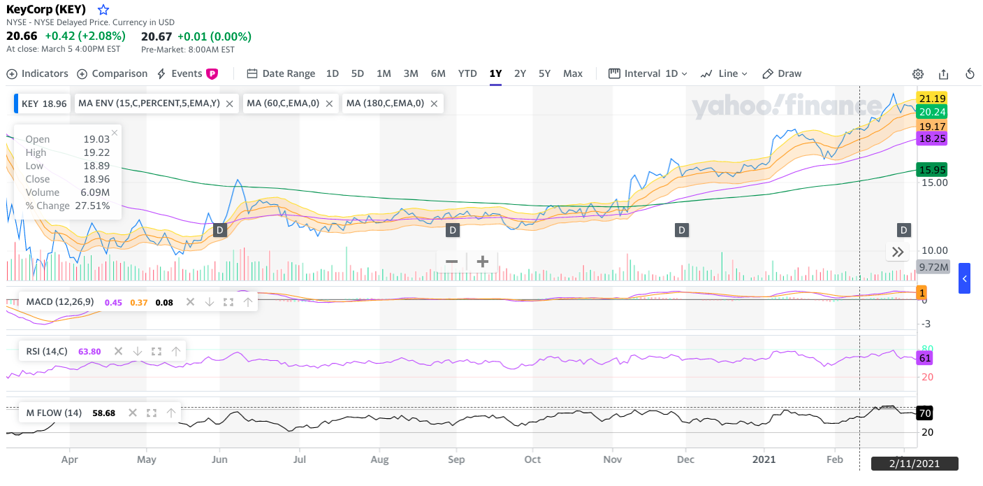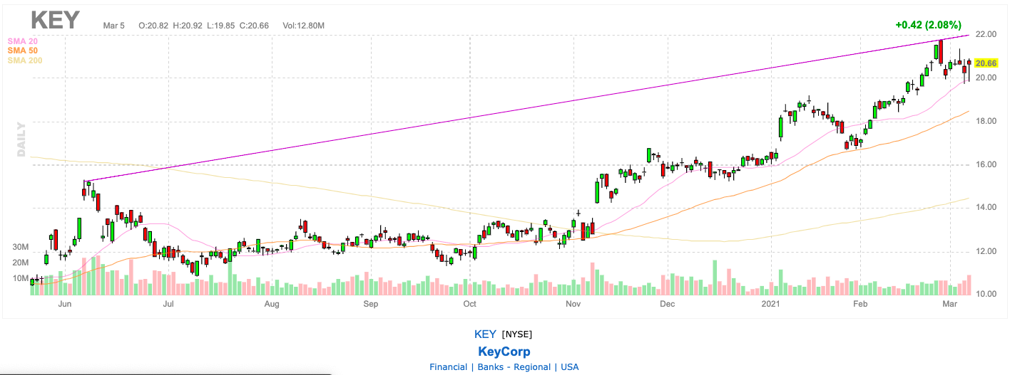 Seeking Alpha에 따르면 KeyCorp는 "자본 위치가 강력"하고 은행은 "최대 9 억 달러"의 자사주 매입을 승인했습니다. 리서치 회사인 Jefferies와 Evercore는 KeyCorp의 2021 년 지침에 긍정적인 반응을 보였고 Goldman의 Nash는 올해 강력하고 긍정적인 운영 레버리지를 제공할 준비가 되어 있다고 믿습니다. KEY 주식은 11.5의 선도 주가 수익률로 거래되며 3.6 % 의 매우 매력적인 선도 배당 수익률을 가지고 있습니다.