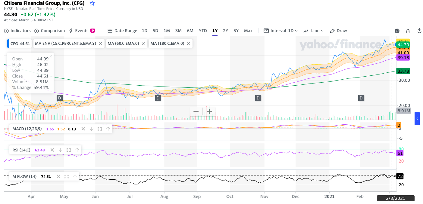또한 Citizens는 작년보다 25 % 의 영업 마진을 기록했으며 총 부채는 2019 년 말 140 억 달러에서 2020 년 12 월 86 억 달러로 감소했습니다. 놀랍게도 전염병으로 인한 어려운 비교에도 불구하고 은행의 매출 은 4 분기에 전년 대비 4 % 증가 했으며, 회사는 올해 대출 증가율이 5 ~ 9 %에이를 것으로 예상합니다.