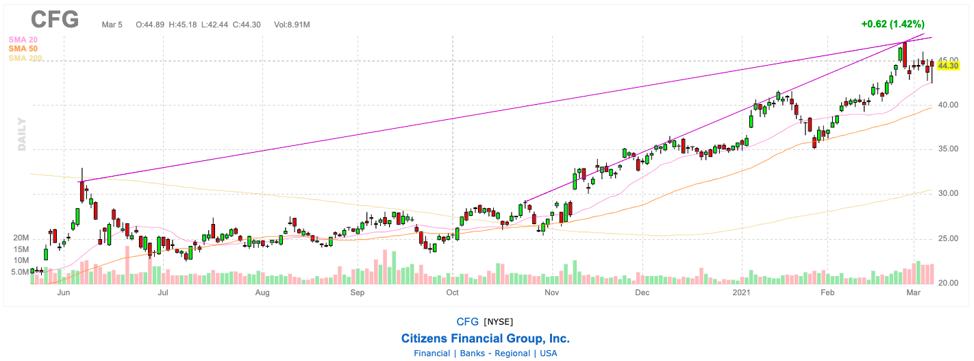 최근 금리 인상을 감안할 때 2021 년 순이자 소득 감소에 대한 은행의 예측은 매우 보수적으로 보입니다. CFG 주식은 3.6 %의 매우 매력적인 배당 수익률을 가지고 있습니다.