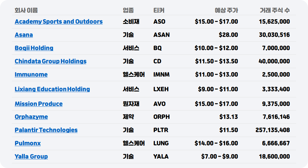 다음주 - 9개 IPO 와 2개의 직상장 (direct listing) 예정