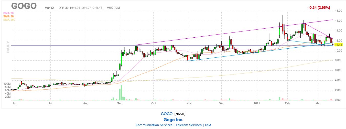 마지막으로 Gogo가 있습니다. 이 회사는 최근 월스트리트가 완전히 인정하지 않을 수 있는 여러 강력한 움직임을 보였습니다. 얼핏 보면 Gogo는 그다지 인상적이지 않을 수 있습니다. 이 회사는 내년에 수익이 거의 20 % 감소하고 주당 5 센트의 손실을 볼 것으로 예상됩니다. 또한 플로트의 28 %가 공매도된 것으로 보입니다. 그러나 Gogo가 용제라는 사실은 황소에게 큰 승리입니다.