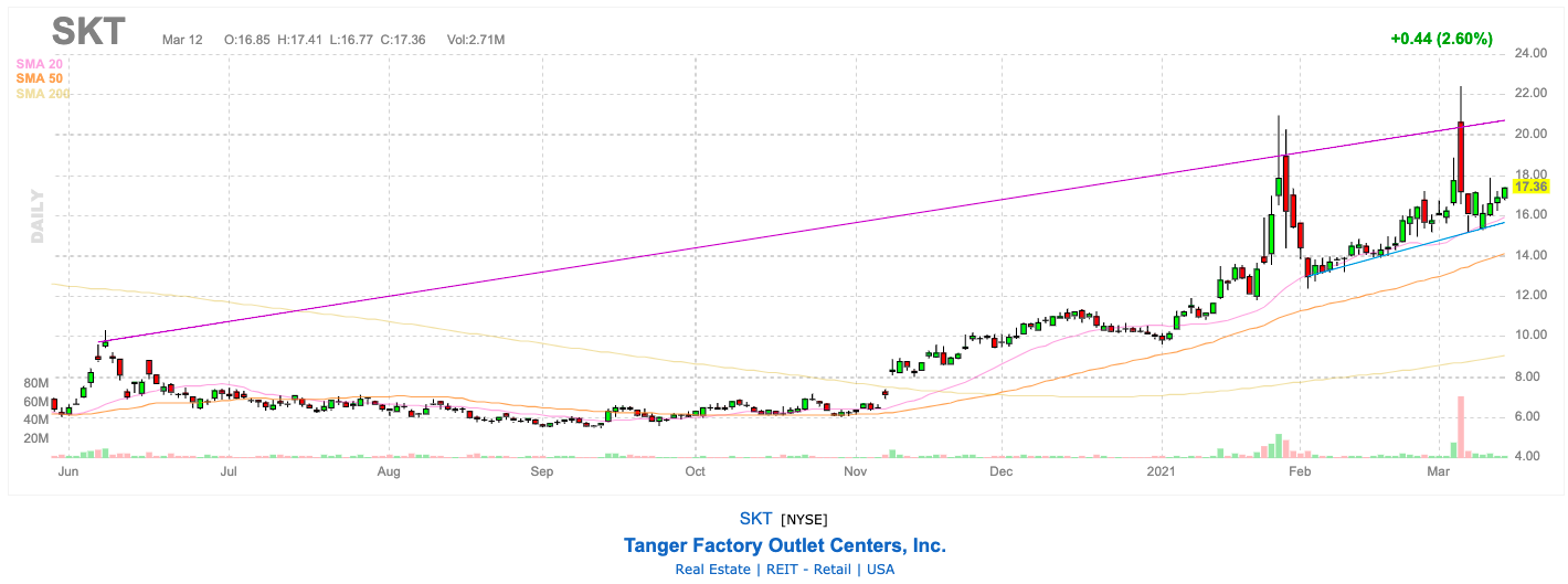 또한 추진력이 있습니다. 1 월이나 2 월에 2021 년 최고치를 기록한 많은 Reddit 주식과 달리 Tanger는 3 월에 그렇게 했습니다. 가격 움직임이 예쁘지는 않았지만 주가는 하락하기 전에 $ 22.40의 새로운 최고치를 기록했습니다. 그것은 또한 추적하는 사람들에게 52 주 최고였습니다. 한때 주가는 전날보다 26 % 이상 반등했지만 주가가 3.3 % 하락한 것을 깨달은 후 추악한 가격 행동이 분명해졌습니다.