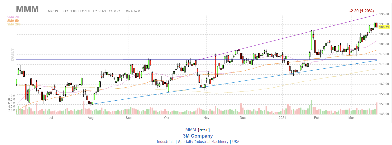 주식의 약세는 소득 투자자들이 2021 년 초 이후 주식이 7 % 상승했음에도 불구하고 여전히 3.2 % 의 수익률을 얻을 수 있는 기회였습니다. CEO Mike Roman 은 그가 전염병을 예상하지 못했지만 3M의 제품 라인은 이에 대비했습니다. 이제 COVID 이후 세상에서 길을 이끌 것은 3M의 산업 그룹입니다. 산업 주식은 새로운 정부 자금 조달을 예상하면서 날아가고 있으며, 3M은 주요 공급 업체이므로 MMM 주식은 상승했습니다.
