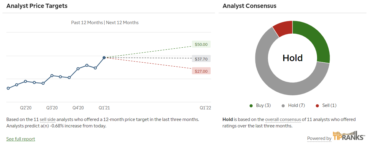 애널리스트 평가 - 홀드, 향후 12개월 최대 50달러, 최저 27달러 전망