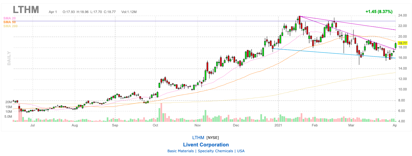 Livent는 이름에서 알 수 있듯이 리튬 순수 플레이입니다. 이 회사는 이전에 FMC Corporation (NYSE : FMC )의 자회사였으며 분사 이후 주가가 급등했습니다. 사무실에 있는 Biden과 청정에너지에 대한 낙관주의가 빠르게 성장함에 따라 Livent 주식은 지난 1 년 동안 250 % 이상 상승했습니다. 이러한 기념비적인 상승은 확실히 가치 평가 측면에서 적신호를 불러일으키지만, 주식은 산업 성장에 따라 더 증가할 수 있습니다.