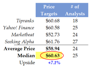 그러나 Marketbeat.com 은 24 명의 분석가가 52.73 달러의 더 낮은 목표를 가지고 있는 반면 Seeking Alpha는 27 명의 분석가가 61.36 달러의 평균 목표를 가지고 있다고 말합니다.