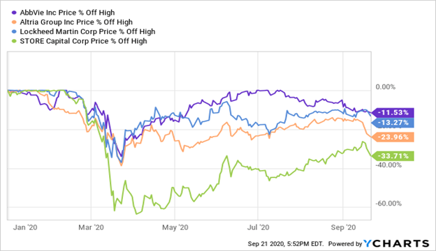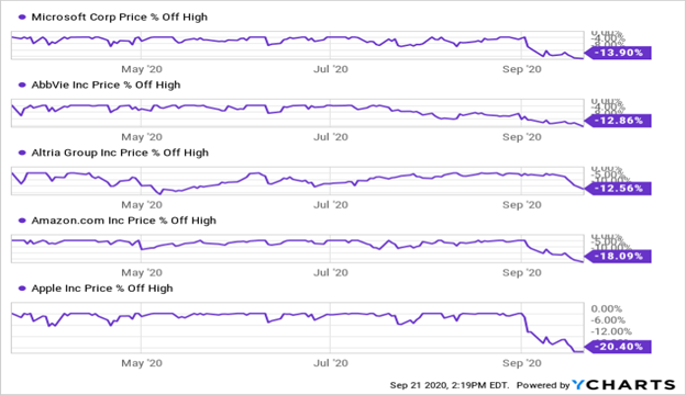 Microsoft ( MSFT ), AbbVie ( ABBV ), Altria ( MO ), Amazon ( AMZN ) 및 Apple ( AAPL )은 모두 최고가 대비 약 20 % 할인 중이다.