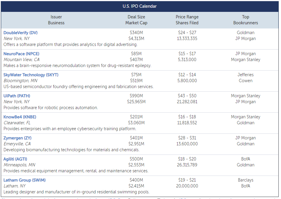 금주의 최대 IPO 인 UiPath ( PATH )는 260 억 달러의 시가 총액으로 9 억 9 천만 달러를 모금할 계획입니다. 이 회사는 조직 전반에 걸쳐 자동화 기회를 식별하는 소프트웨어를 제공합니다. 빠르게 성장하고 수익성이 없는 이 회사는 올해 1월 기준 8,000 명의 고객을 보유하고 있으며 이중 Fortune 10 대 기업의 80 % 와 Fortune Global 500 대 기업의 63 %를 포함했습니다.