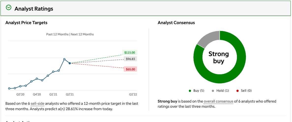애널리스트 향후 12개월 목표 주가 최대 $115, Strong buy 가 다수