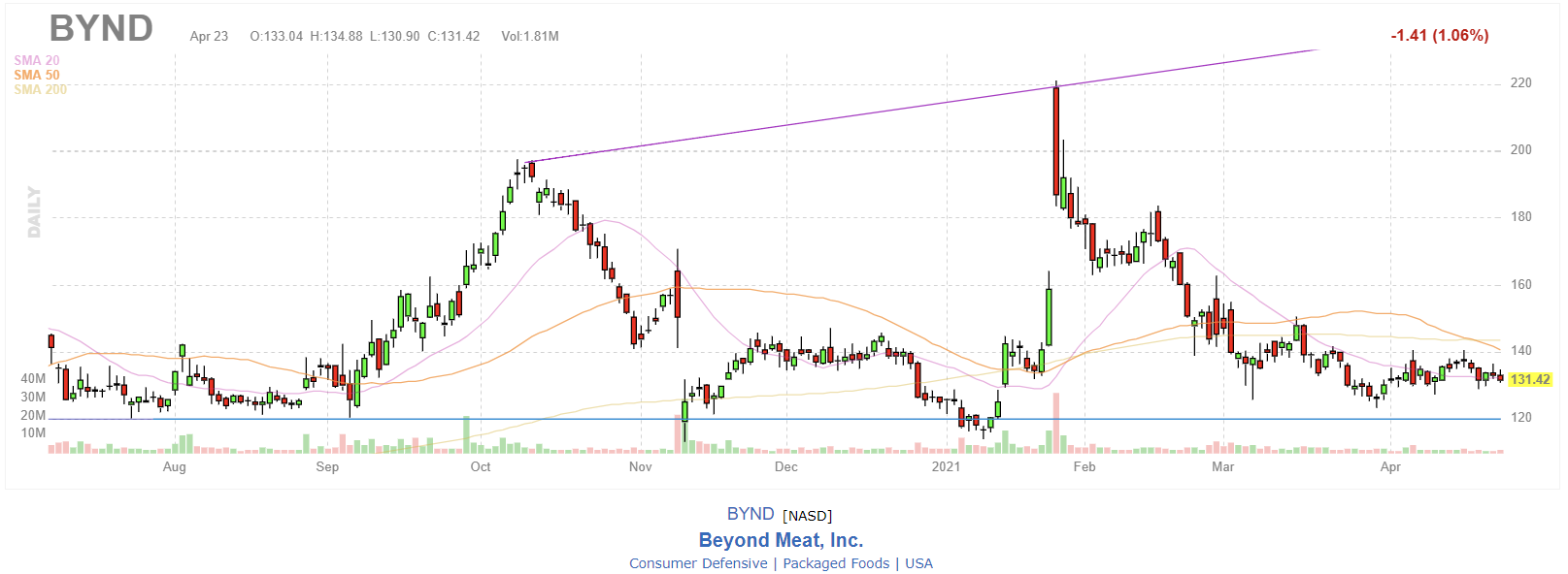 식물 기반 육류 대체 생산 업체인 비욘드 미트 (NASDAQ : BYND )는 2012 년에 "치킨 프리 스트립"을 판매하기 시작했으며 2019 년에는 캘리포니아에 본사를 둔 회사가 상장되었습니다. Beyond Meat의 IPO는 미국 기업의 가장 큰 IPO 중 하나였습니다. 상장되었을 때 15 억 달러로 평가되었고 3 개월 후 130 억 달러 이상의 가치가 있었습니다. 주식은 지난 12 개월 동안 51 % 상승했습니다.