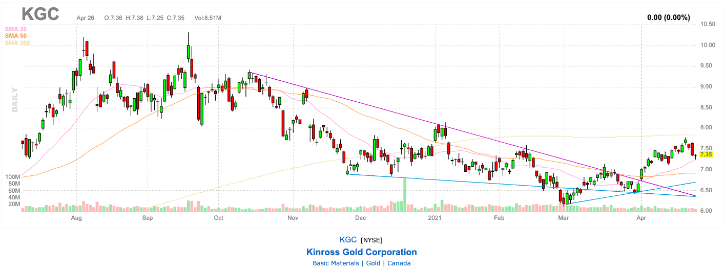 토론토에 본사를 둔 이 광산 회사는 모리타니, 가나, 칠레, 에콰도르, 브라질, 러시아, 캐나다에서 은과 금광을 운영하고 있으며 미국 Jim Simons의 Renaissance Technologies는 3,800만 주가 넘는 주요 투자자 중 하나였습니다. Kinross는 2020 년 4 분기에 약 62 만 2 천 온스의 금을 생산했으며 1 년 동안 240만 온스를 생산했다고 보고 했습니다. 회사는 2020 년 4 분기에 보통 주당 0.03 달러의 배당금을 발행했습니다.