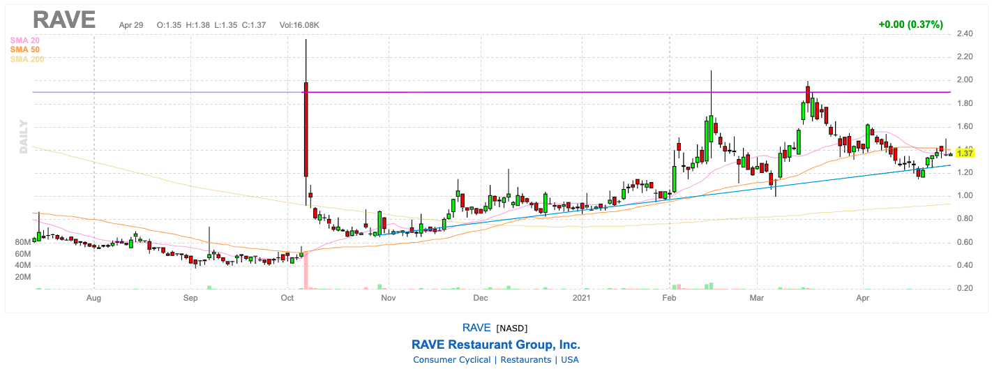 Rave Restaurant의 순이익은 2020 년에 629 % 증가하여 $ 102,000로 증가했습니다. 이 회사는 또한 작년에 630 만 달러의 현금으로 마감했습니다. Rave Restaurant은 사람들이 Covid-19 동면 상태에서 나타나 다시 외식을 시작함에 따라 성공을 구축하기를 원할 것입니다.