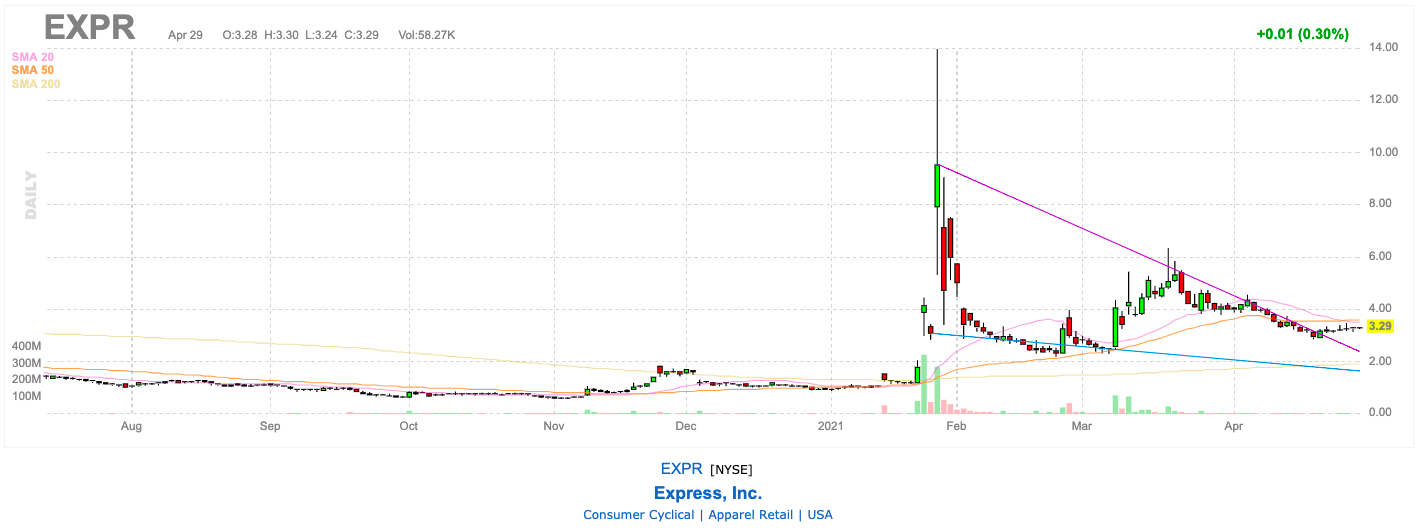 불행히도 Express는 Reddit 투자자가 불합리한 수준으로 끌어올리는 것을 좋아하는 레거시 소매 회사 유형이었습니다. 경제가 회복됨에 따라 Express는 매출 향상과 보다 안정적인 주가를 기대할 것입니다.