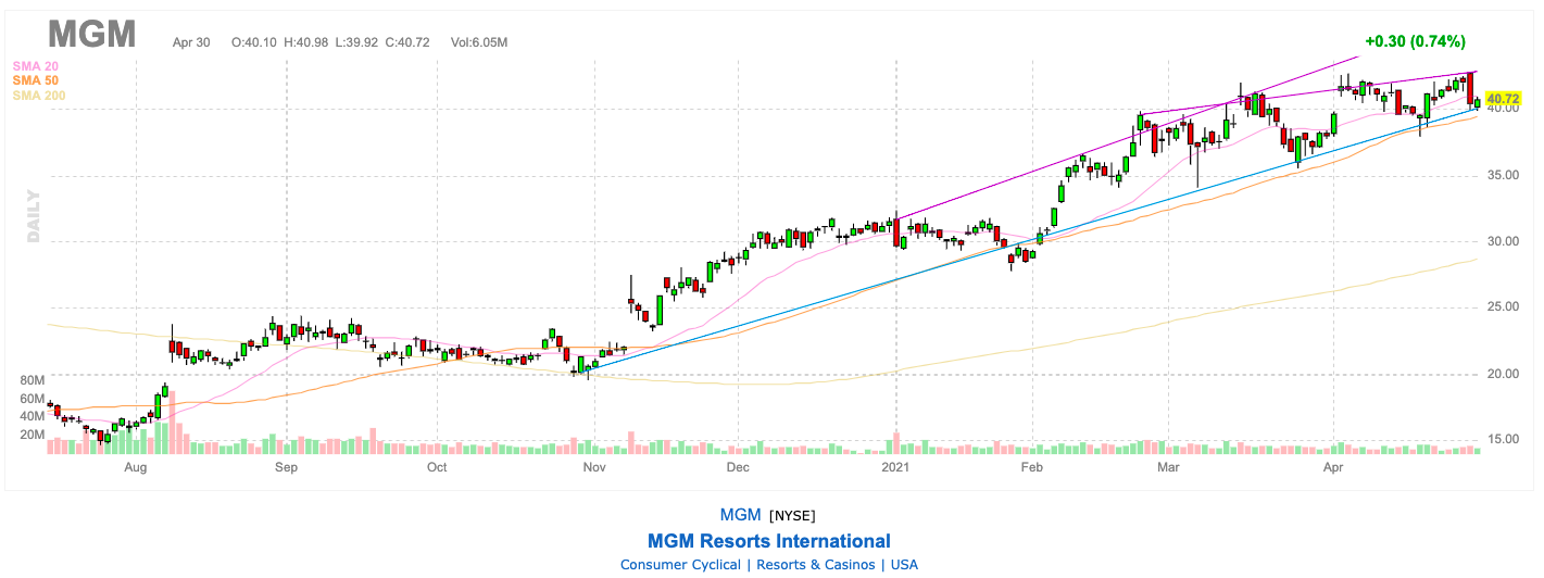 MGM Resorts International (NYSE : MGM)은 애널리스트들의 낙관적인 평가와 호텔의 점유율이 지속적으로 급증하면서 지난 몇 주 동안 거래되었습니다. 4 월 29 일 회사는 호텔 점유율이 3 월에 약 62 %를 기록했지만 4 월에 73 % 까지 급증하여 회사의 유행 후 회복을 주도했다고 발표했습니다.