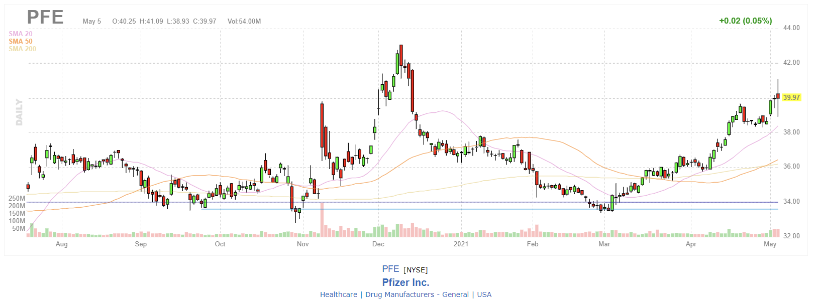 Pfizer Inc. (NYSE : PFE)는 1849 년에 설립된 뉴욕에 기반을 둔 제약 회사입니다. 현재 매입할 수 있는 10 대 Robinhood 주식 목록에서 4 위를 차지했습니다. 이 회사는 COVID-19 백신의 주요 생산자 중 하나이며 최근 12 세 미만 어린 이용 백신 시장에 대한 규제 승인을 구했습니다. 화이자 주식은 작년과 52 주 범위의 코로나 바이러스 백신의 성공적인 시험을 발표 한 이후 상승했습니다. 주가는 $ 29- $ 42 사이입니다.