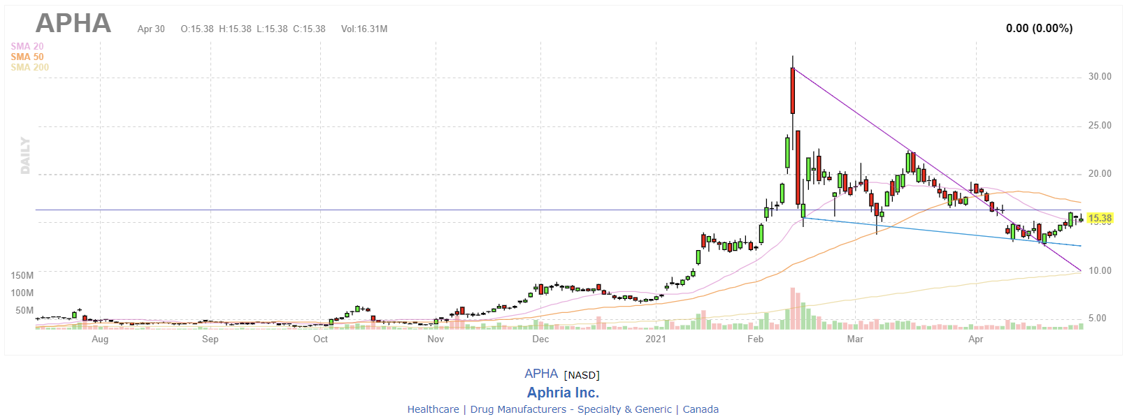 APHA는 현재 구매할 수 있는 최고의 Robinhood 주식 목록에서 7 위를 차지했습니다. Aphria Inc. (NASDAQ : APHA)는 약용 및 레크리에이션 용 대마초를 재배하고 판매하는 캐나다 기반 회사입니다. 2014 년에 설립되었으며 현재 구매할 수 있는 최고의 Robinhood 주식 10 개 중 7 위를 차지했습니다. 이 회사는 Solei, RIFF, Good Supply, Aphria, P'tite Pof 및 Broken Coast와 같은 브랜드를 소유하고 있습니다. 52 주간 Aphria 주식의 가격 범위는 $ 3- $ 40입니다. 이 회사는 2019 년에 4 억 달러에 가까운 연간 매출을 올렸으며, 2020 년 수치를 발표할 준비가 되면서 5 억 달러에 가까운 수치를 올릴 것으로 예상됩니다.