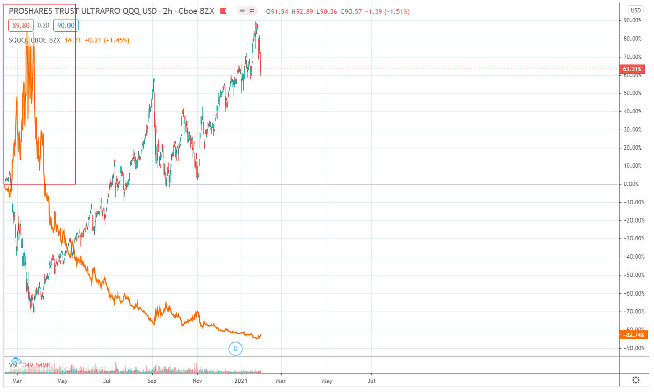 ProShares UltraPro Short QQQ( SQQQ )는 큐브 지수에 대한 역 3배 노출을 제공하며 시장 움직임을 헤지 하거나 투기하는 도구로 사용하도록 설계되었습니다. 이 포지션의 장기 매수 후 보유를 권장하지는 않지만 시장 하락에 대비하는 매우 효과적인 방법이 될 수 있습니다. Covid 위기 동안 최고점에서 최저점까지 TQQQ는 ~69% 하락한 반면 SQQQ는 ~102% 성장했습니다.
