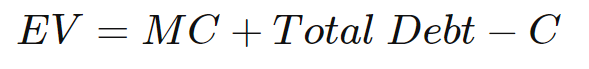 EV 계산에는 회사의 시가 총액뿐만 아니라 단기 및 장기 부채와 회사 대차 대조표의 현금도 포함합니다. 기업 가치는 잠재적인 인수에 대한 회사 가치 평가에 사용되는 인기 있는 측정 항목입니다.