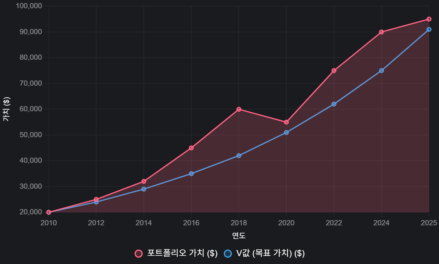 - 빨간 선(포트폴리오 가치): 실제 자산 변화를 보여주죠. 2010~2019년 상승장에서는 V값을 따라가며 꾸준히 증가했어요.