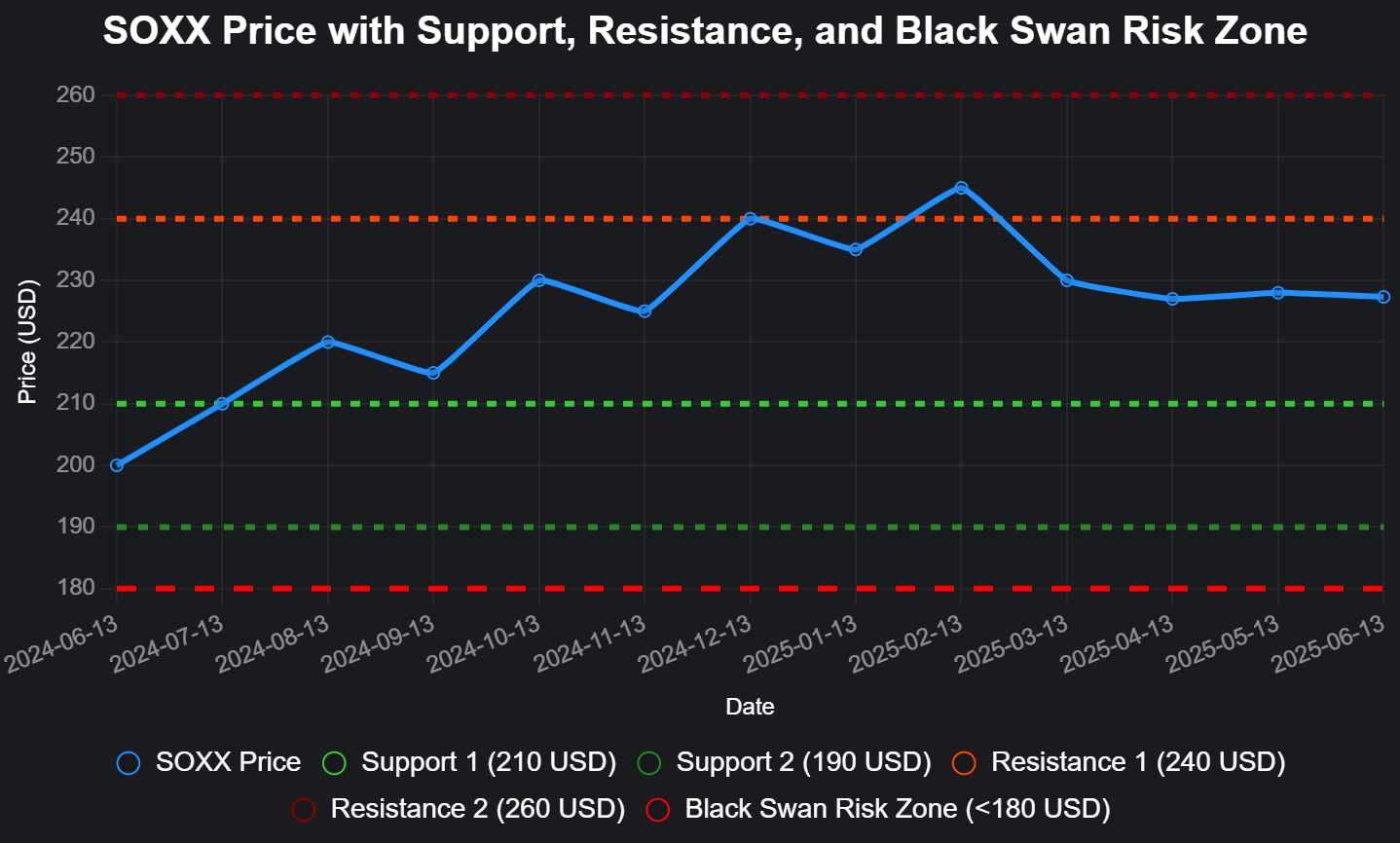 - SOXX의 주요 지지선(210 USD, 190 USD)을 기준으로 매수 타이밍을 잡아, 급락 시 저가 매수 기회를 노리세요. 블랙스완 이벤트로 인한 하락은 일시적일 가능성이 높습니다.
