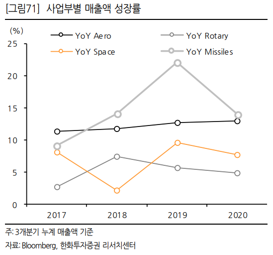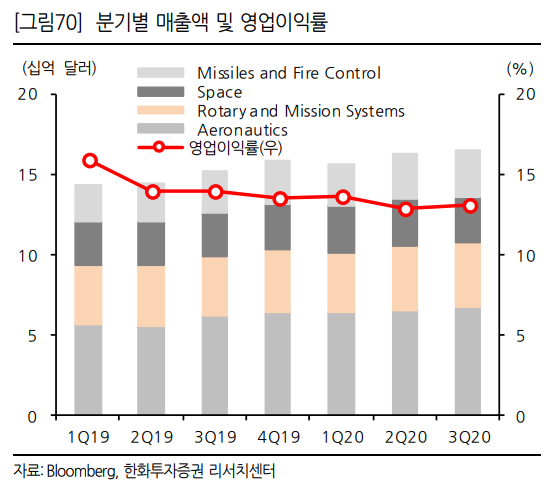 3분기, 31대의 F-35를 인도한 Aeronautics 사업부의 실적 호조(매출액 67억 달러, YoY +8%)가 주효했다. 영업이 익률은 전년동기대비 -0.2%p 감소한 10.6%를 기록했다. F-35 매출 증가로 생산비 및 개발비용 등 고정비 부담이 완화됐으나, F-16 관련 위험 부담 비용 증가로 일부 상쇄됐다.