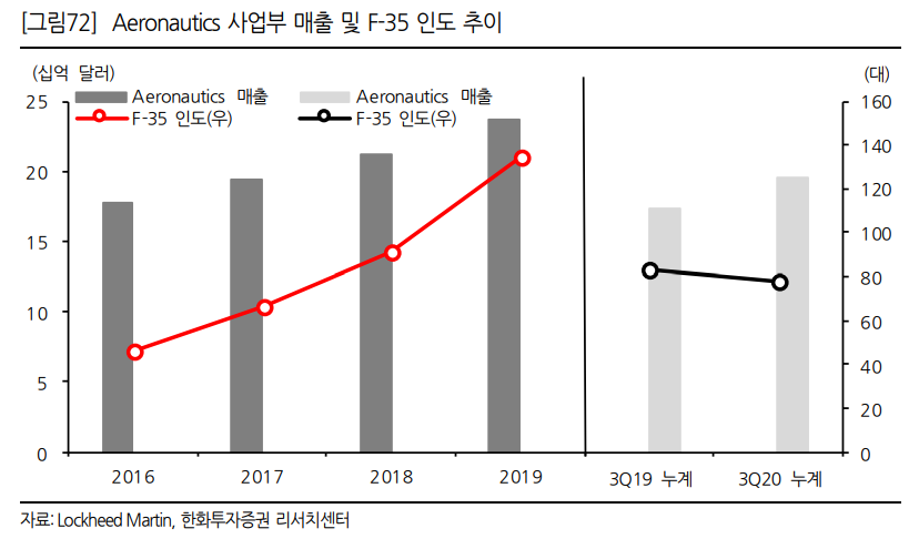 최근 카타르 정부가 미국에 F-35 구매 를 공식 요청했으며, 스위스, 싱가폴, 핀란드, 한국 등 다수 국가로의 판매가 지속적으로 발생하고 있다. 동 전투기를 생산하는 Aeronautics 사업부 수주잔고는 578억 달러 수준이다.