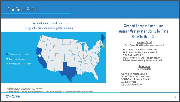 규제를 받는 유틸리티 인 San Jose Water Company는 약 230,000 개의 연결을 보유하고 있으며 실리콘 밸리 지역의 거의 100 만 명에 가까운 교육을 받고 부유 한 고객에게 물을 제공합니다. CTWS를 인수하면서 코네티컷과 메인에서 138,000 개의 연결과 450,000 명의 고객이 추가되었습니다.
