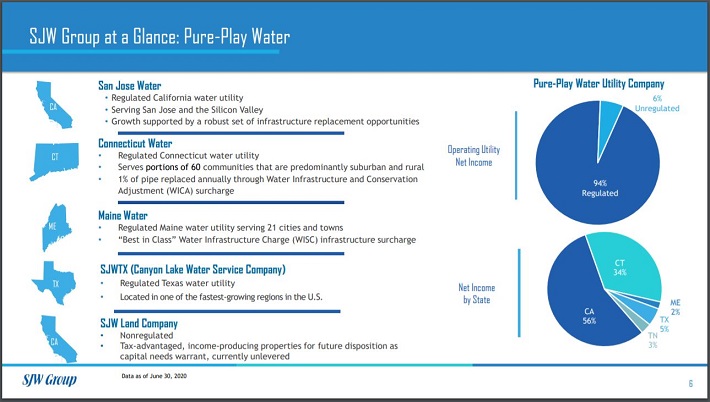 SJW와 CTWS의 합병은 회사의 비즈니스 모델을 다각화하는 데 도움이되었으며, 합병 된 법인은 수입을 위해 캘리포니아에만 의존하지 않게되었습니다. SJW는 여전히 최고로 무겁습니다. 단 2 개 주만 소득의 90 %를 기여하지만 이는 합병 이전의 각 개별 회사에 비해 개선 된 것입니다.