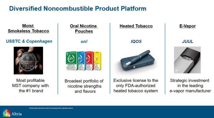 알트리아는 말보로, 스코알(Skoal), 코펜하겐 및 세인트 미셸 브랜드로 담배, 씹는 담배, 시가, 전자 담배 및 와인을 판매한다.또한 Anheuser-Busch InBev (BUD)의 지분 10 % 를 보유하고 있으며, 전자 담배 제조업체 JUUL의 지분 35 %, 마리화나 회사 Cronos Group (CRON)의 지분 45 %를 보유하고 있다. Altria의 시가 총액은 720 억 달러로 대형주로 분류된다.