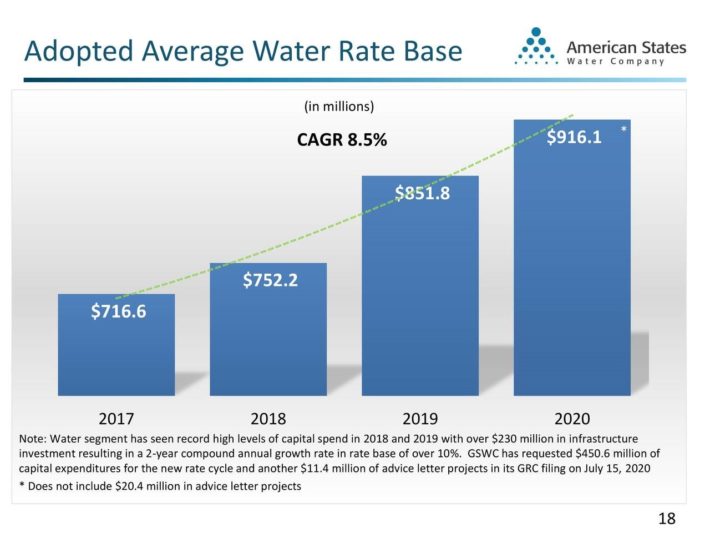 이미 언급했듯이 유틸리티는 막대한 자본 지출에 대한 대가로 규제 당국으로부터받는 요금 인상이 부진하기 때문에 일반적으로 저성장 주식입니다. AWR은 최근 몇 년 동안 규제 된 물 사업에서 연평균 8.5 %의 예외적인 인상을 누 렸기 때문에 이러한 측면에서 대부분의 유틸리티보다 우수합니다.