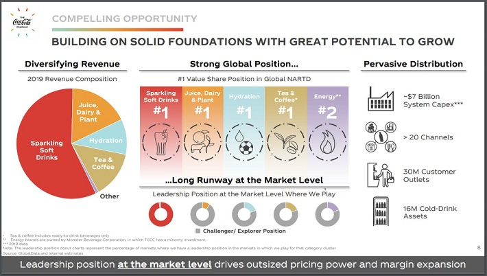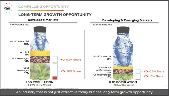 투자자들은 코카콜라의 보틀링 부문을 매각하려는 움직임을 선호한다. 지난 2월에 인도의 보틀링 부문을 매각한다는 발표로 이러한 계획의 주요 부분이 마무리되었다.이로 인해 수년 동안 상당한 수익 감소가 발생했지만 최종 적으로는 더 높은 마진을 가져다줄 것이다. 2020 년에 이 매각 작업이 모두 완료되면 수익성 개선과 마진도 증가할 것으로 기대한다. 코카콜라는 세계에서 가장 큰 음료 회사이지만 추가 성장할 가능성이 있다.